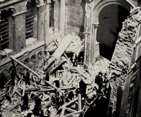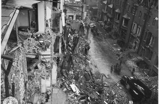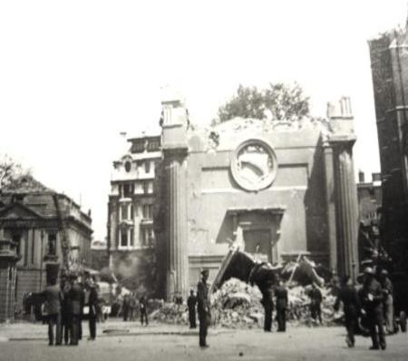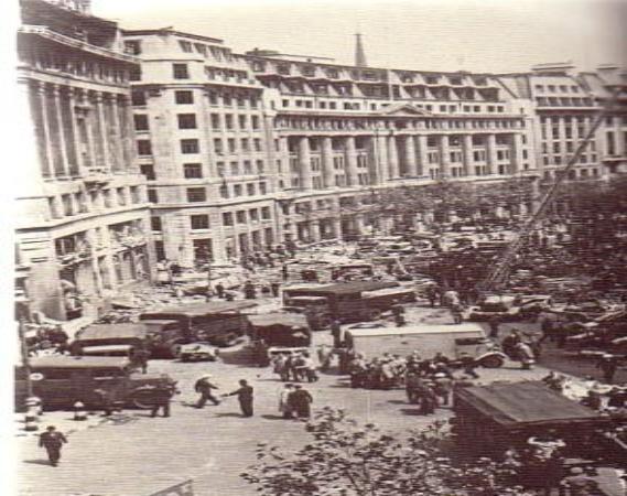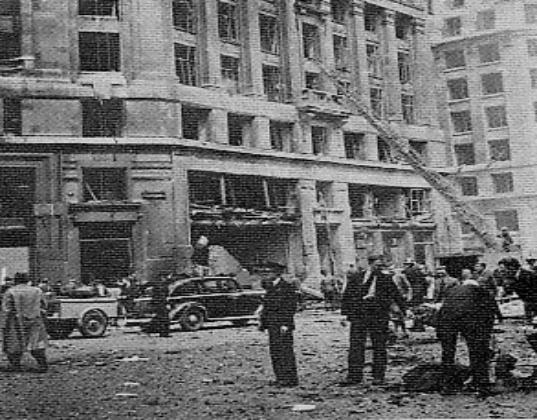 | The Aldwych was packed with people on their lunch hours when the V1 struck. Others were at their desks and some of the girls from the Air ministry were sunbathing on the roof. The modern steel-frame buildings stood up well to the blast and indeed much of it was absorbed by the blast wall outside the Air Ministry. This caused the blast to be channelled down the street rather than dissipating in collapsing buildings. Numerous people were mown down killed or maimed, more died in the ruins of buses and the girls on the Air ministry roof also perished. Some workers at the Air Ministry were sucked out of office windows by the blast and vacuum and died . 48 people were killed and many more injured. |