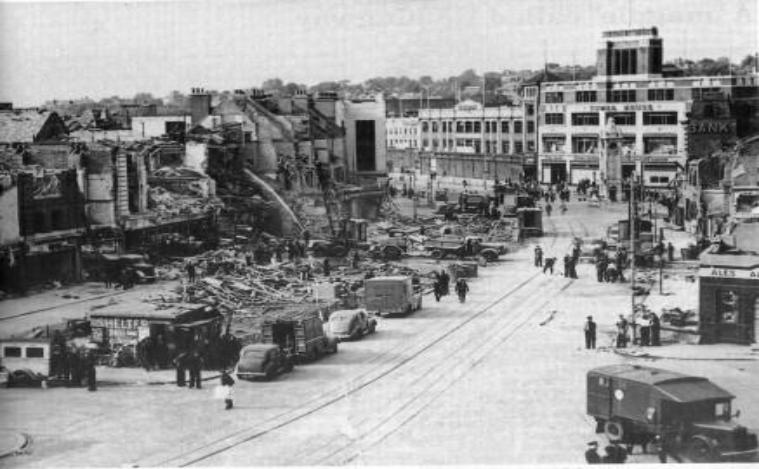 | The V1 exploded on the roof of a shelter outside Marks and Spencer. Major damage was caused to the shops which also include Woolworth's and Sainsburies and also to the market. 59 people died in this tragedy and a further 124 were very seriously injured. Hundreds of others suffered less serious injury. Casualties occurred in the shops, in the basement café of Woolworth's and on passing buses. The Post Office was also badly damaged. This was the worst single V1 incident in South London. The blast area was particularly large and extended Up to 600 yards in each direction. This is indicative of the larger and more powerful warheads used by the Nazis later in the attacks. In total about 100 shops were very badly damaged and flats, shops and houses suffered varying degrees of damage across a wide area. The High Street in this point was completely re-built after the war on both side of the road. |