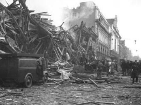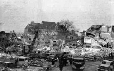This was the worst tragedy of the entire V weapon attacks. Reports from a number of witnesses tell the V2 was seen in its last moments of flight, a line drawn across the grey November sky. The store bulged outwards and then imploded and in the carnage 168 people were killed and 121 were seriously injured. As the rocket exploded there was blinding flash of light and an enormous roar followed by a dense cloud of smoke and powdered dust. Witnesses several hundred yards away felt the warm blast on their faces,some were physically pushed backward by its force. The Co-Op Store next door also collapsed killing more people inside. The bodies of passers-by were flung for great distances, and an army lorry was overturned and destroyed killing its occupants. A double decker bus spun round causing yet more deaths and injuries,i ts occupants were seen, still sitting in their seats covered in dust. There were piles of masonry and pieces of bodies all around, where Woolworth's had been now an enormous gap. The debris stretched from the town hall to New Cross Gate station and it took 3 days to clear this and retrieve the bodies from the debris. Today, the site has been totally re-developed but the extent of the damage area can be seen from where the new buildings commence both in the New Cross Road and in surrounding streets. Lewisham council have erected a blue plaque on the building to commemorate the tragedy |