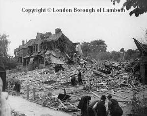 Dulwich was on the receiving end of 41 V1's and 3 V2. It is hardly surprising so many Flyings Bombs fell as the Nazis erroneously had North Dulwich Station as their mean aiming point. The worst tragedies were when a V1 hit the Co-op in Lordship Lane killing 23 and when a rocket struck Etherow Street killing 24 |